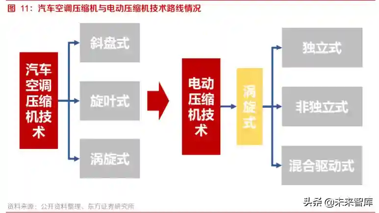 在新能源汽车上,由于没有燃油发动机,为配合高速电机的运转,涡旋式电动压缩机成为主流技术路线,主要因为其具备的高效率和高转速承受力。同时涡旋式电动压缩机可以通过电控单元调节电机的速度以提高空调系统效能,降低整体能耗,因而更适合新能源汽车使用。