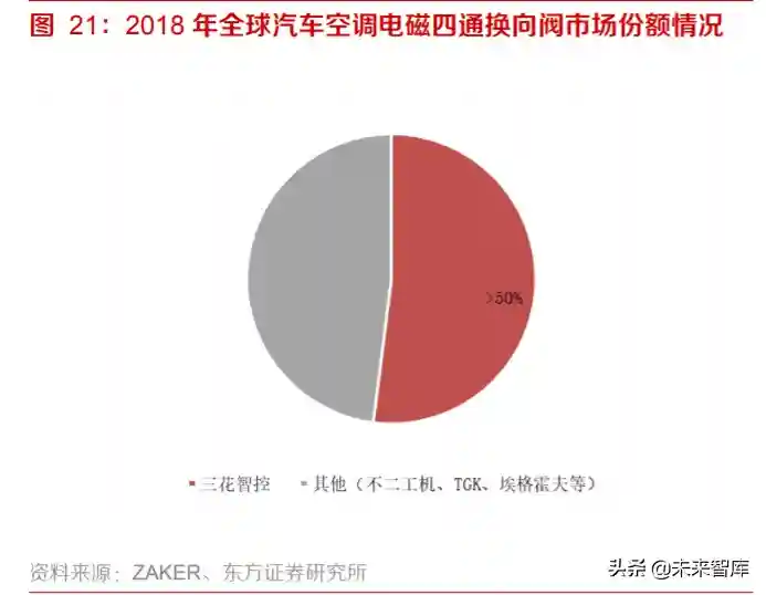 在汽车热泵空调领域,电磁四通换向阀的主要供应商为三花智控旗下三花汽零、日本的不二工机、日本TGK、德国埃格霍夫等。日本TGK是一家主要从事主要生产汽车空调部件和汽车控制系统部件的公司,市场主要集中于日本、韩国、中国及欧洲。德国埃格霍夫主要生产汽车空调部件生产,产品主要供应欧洲市场和中国市场。三花智控在汽车热泵空调的电磁四通换向阀领域也处于领先的地位,全球市占率超过50%。