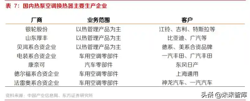 国内新能源车热泵空调换热器市场主要生产企业有两类,一是内资汽车零部件厂商,包括银轮、扬州水箱、山东厚丰、长江电工等,二是合资换热器生产商,主要包括上海贝洱、天津电装、上海德尔福、富奥翰昂等。