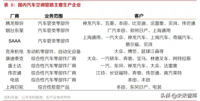 国内从事汽车空调管路业务的公司包括克来机电、腾龙股份、上海汽车空调配件(SAAA)、康迪泰克大洋管件(长春)、常州盛世达、汉拿伟世通空调(南昌)等公司,其中多家公司是海外零部件公司在国内的合资公司。