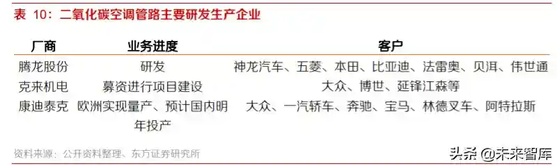 克来机电是新进入汽车空调管路市场的企业,2019年,克来机电组建了二氧化碳空调管路研发团队,并实现技术突破,目前正在募资建设二氧化碳空调管路项目生产线。克来机电主营是汽车零配件及汽车自动化设备,下游客户包括整车厂商和汽车零部件公司两大类,其中以大众系、博世系、延锋江森公司为主。